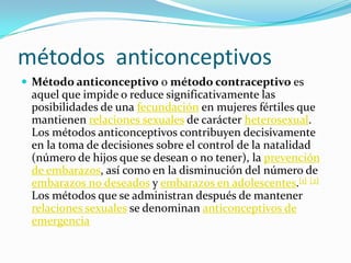 ![métodos anticonceptivosMétodo anticonceptivo o método contraceptivo es aquel que impide o reduce significativamente las posibilidades de una fecundación en mujeres fértiles que mantienen relaciones sexuales de carácter heterosexual. Los métodos anticonceptivos contribuyen decisivamente en la toma de decisiones sobre el control de la natalidad (número de hijos que se desean o no tener), la prevención de embarazos, así como en la disminución del número de embarazos no deseados y embarazos en adolescentes.[1][2] Los métodos que se administran después de mantener relaciones sexuales se denominan anticonceptivos de emergencia](https://image.slidesharecdn.com/daniela-110308082038-phpapp02/85/Daniela-2-320.jpg)