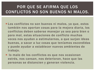 El documento discute que los conflictos no son inherentemente buenos o malos, sino que pueden tener beneficios como estimular ideas nuevas y sacar a la luz aspectos ocultos. Sin embargo, también pueden causar estrés y distanciamiento. Aunque los conflictos a veces ayudan a cambiar las perspectivas y conocer mejor a los demás, no siempre es apropiado negociarlos, especialmente si uno estaba equivocado. En su lugar, a veces es mejor colaborar, evitar, imponerse o renunciar, dependiendo de factores como la urgencia y importancia