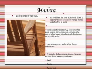 El documento clasifica y describe diferentes materiales como la madera, metal, vidrio, cerámica, textiles, plástico, petreos. Cada material se describe en términos de su origen, características, usos comunes y cómo se presentan en el mercado.