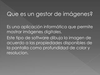 Este documento define un gestor de imágenes como una aplicación que permite mostrar imágenes digitales y dibujarlas según las propiedades de la pantalla, y un gestor de videos como una herramienta para organizar y modificar videos. Explica que los gestores de imágenes ofrecen mejor calidad, color y resolución de imágenes, aunque archivos pesados pueden ralentizarlos. Finalmente, lista algunos formatos comunes de imágenes como TIFF, EPS, PSB, GIF y JPG.