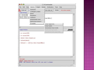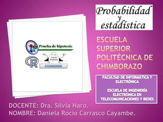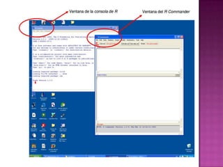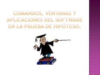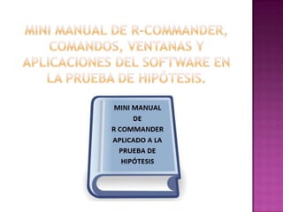 El documento explica la definición de hipótesis y pruebas de hipótesis en estadística, destacando su uso para verificar aseveraciones sobre poblaciones mediante datos muestrales. Se presenta R Commander, una interfaz gráfica que facilita el uso del entorno estadístico R sin necesidad de conocer su lenguaje de comandos. Además, se ejemplifican contrastes de hipótesis, incluidos test t para medias y proporciones, utilizando conjuntos de datos específicos.