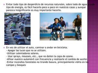 El documento propone varias acciones sencillas que los individuos pueden tomar para ayudar a mitigar el cambio climático y proteger el medio ambiente, como usar menos el automóvil, apagar las luces innecesarias, y evitar los aerosoles que dañan la capa de ozono. También enfatiza la importancia de reducir el consumo de energía, reciclar, plantar árboles, y adoptar estilos de vida más sustentables para frenar el calentamiento global.