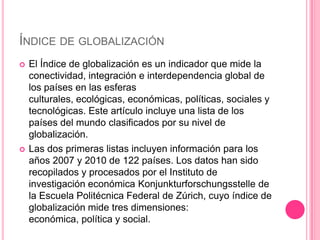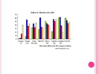 Este documento resume varios temas relacionados con la globalización como el Índice de Globalización, el PIB de Colombia en 2012, la crisis europea y la recesión. Luego analiza cómo Colombia se ha enfrentado al proceso de globalización, el cual le ha sido impuesto desde fuera. Las élites colombianas han aceptado y buscado este tipo de "inserción" en la economía global a pesar de sus altos costos sociales y ambientales.