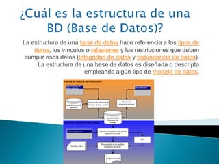 La estructura de una base de datos se refiere a los tipos de datos, las relaciones y restricciones de los datos. Una base de datos es un conjunto de datos no redundantes almacenados en un soporte informático y accesibles simultáneamente por distintos usuarios y aplicaciones. Una base de datos relacional permite establecer interconexiones entre los datos guardados en tablas para relacionarlos.