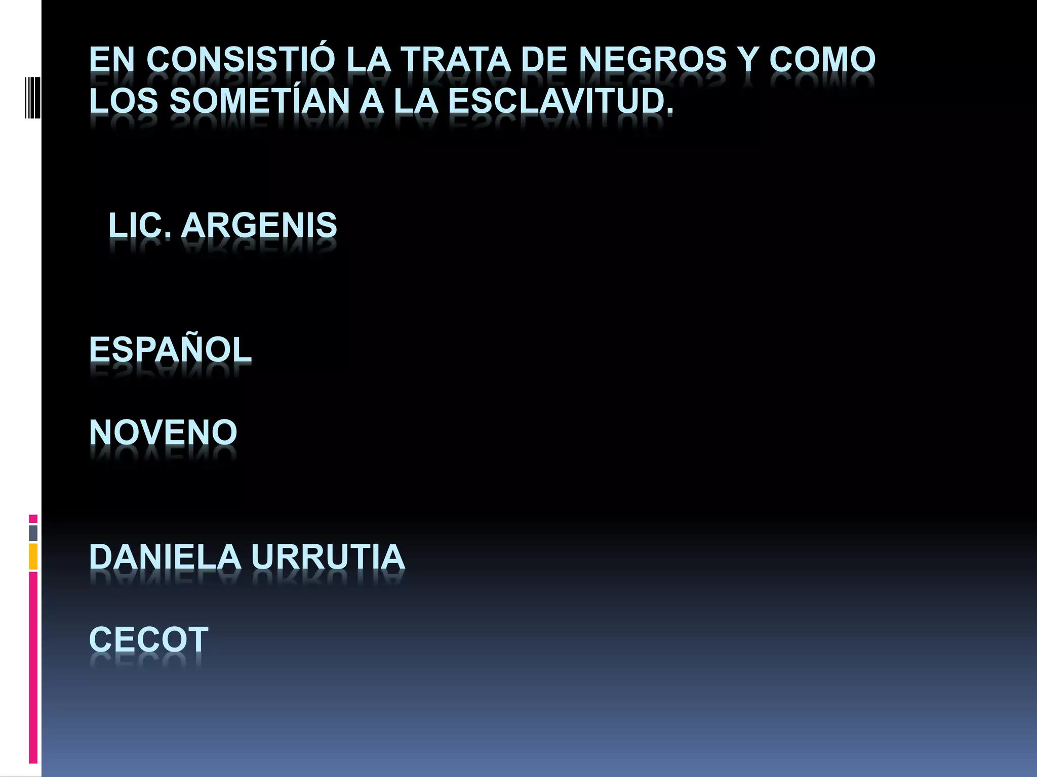 El documento describe cómo se desarrolló la trata de esclavos negros y cómo eran sometidos a la esclavitud. Inicialmente, el comercio de esclavos en África occidental era a pequeña escala y los esclavos trabajaban principalmente para reyes y personas importantes. Sin embargo, la demanda europea a partir del siglo XVI hizo que el comercio de esclavos creciera significativamente. En las colonias americanas, los negros africanos esclavizados ocupaban la posición más baja y trabajaban