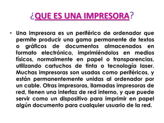 Este documento describe los diferentes tipos de impresoras, incluyendo impresoras de matriz de puntos, de chorro de tinta, láser y plotter. Explica que una impresora es un periférico que permite imprimir textos o gráficos almacenados en formato electrónico en papel u otros medios, y que el tipo de impresora depende de factores como la tecnología, calidad y precio requeridos.