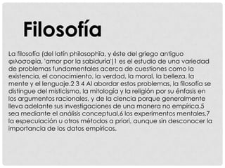 Este documento presenta una introducción a la filosofía, definiéndola como el estudio de problemas fundamentales sobre la existencia, el conocimiento, la verdad, la moral y el lenguaje. Explica que la filosofía se distingue de otras disciplinas por su énfasis en los argumentos racionales. Además, resume las principales ramas de la filosofía, incluyendo la metafísica, gnoseología, lógica y estética.