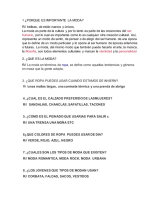 La moda es importante como una forma de expresión cultural que define la identidad de una época. Representa las tendencias y estilos que la gente adopta en masa. Existen diferentes tipos de moda como la moda romántica, urbana y rockera que los jóvenes usan para expresar su estilo personal.