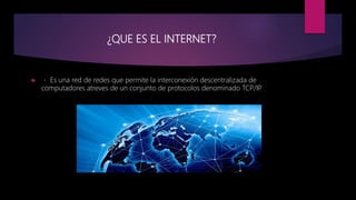 El documento proporciona información sobre el Internet. Explica que el Internet es una red de redes que permite la interconexión descentralizada de computadoras a través de protocolos como TCP/IP. También describe algunas ventajas del Internet como la facilidad de comunicación y acceso a información las 24 horas. Además, cubre temas como los tipos de páginas web comunes, la importancia del diseño web, y la diferencia entre un blog y una página web.