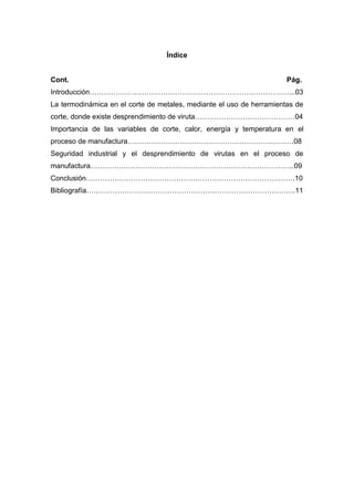 Este documento describe la importancia de la termodinámica en el corte de metales mediante el uso de herramientas de corte donde se produce el desprendimiento de virutas. Explica que el corte de metales es un proceso termodinámico donde se genera calor debido a la deformación plástica y la fricción. También destaca que predecir la temperatura de corte es importante para optimizar los parámetros de corte y reducir costos. Por último, resalta que los procesos de mecanizado son comunes en la industria