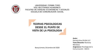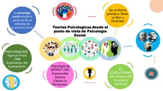 La psicología social estudia la conducta de los individuos en su entorno social y cómo se ve influenciada por otros. Se conformó gracias a pensadores como Tarde, Le Bon y Durkheim. Existen varias teorías psicológicas clave como el conductismo de John Watson, la psicología gestalt de Geralt y el psicoanálisis de Sigmund Freud, el cual explora el inconsciente.