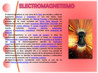 El documento describe la teoría del electromagnetismo, la cual estudia y unifica los fenómenos eléctricos y magnéticos. El electromagnetismo se basa en las ecuaciones de Maxwell y describe estos fenómenos mediante campos eléctricos y magnéticos. Es una de las cuatro fuerzas fundamentales conocidas en el universo.