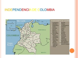 La independencia de Colombia se produjo a lo largo de la década de 1810, liderada por figuras como Antonio Nariño y Francisco de Paula Santander, que derrotaron a los realistas españoles. Simón Bolívar jugó el papel más destacado en las luchas posteriores, derrotando definitivamente a los españoles en 1819. Ese mismo año se proclamó la República de la Gran Colombia, formada por lo que hoy son Panamá, Venezuela y Ecuador. En 1821 se aprobó una constitución para la Gran Colombia con Bolívar como primer