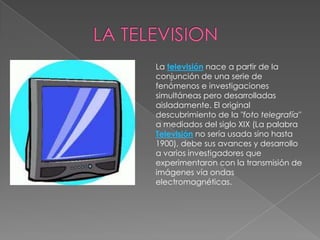 El documento habla sobre los orígenes de la televisión. Menciona que surgió de la combinación de varios descubrimientos e investigaciones relacionadas con la transmisión de imágenes a distancia en el siglo XIX. Entre los hitos tempranos se encuentran experimentos para transmitir imágenes telegráficas y el pantelegrafo de Giovanni Caselli en 1863. Desde entonces hubo varias innovaciones en el campo de la televisión.