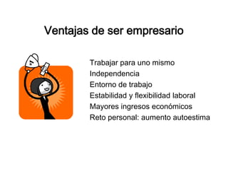Este documento proporciona información sobre cómo convertirse en empresario y las ventajas y requisitos de ser empresario. Detalla las características de un perfil emprendedor exitoso, incluidas ideas de negocio, recursos financieros y la creación de un plan de empresa. Además, explica las diferentes formas jurídicas que puede adoptar una empresa, como una sociedad limitada o cooperativa, y los organismos que ofrecen ayuda a los emprendedores.