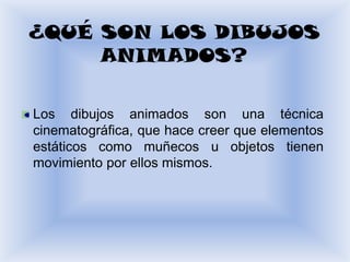 El documento habla sobre los dibujos animados, su origen y evolución. Explica que los primeros dibujos animados aparecieron a principios del siglo XX y evolucionaron hasta convertirse en una forma de expresión artística y una industria. Luego describe algunos géneros populares como el anime japonés, ejemplifica series infantiles como Pocoyo y Sin Chan, y analiza los valores y contravalores que promueven. Finalmente, propone opciones didácticas para el uso de los dibujos animados en la educación