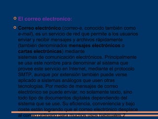 El documento proporciona información sobre el correo electrónico. Explica que el correo electrónico permite enviar y recibir mensajes y archivos rápidamente a través de sistemas de comunicación electrónicos usando protocolos como SMTP. También describe los orígenes del correo electrónico, el proceso de escribir y enviar un mensaje, y algunos problemas comunes como el correo no deseado.