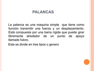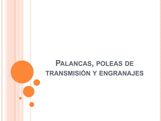 Este documento describe diferentes tipos de máquinas simples como palancas, poleas y engranajes. Explica que las palancas transmiten fuerza y movimiento a través de una barra rígida que gira alrededor de un punto de apoyo. Describe tres tipos de palancas dependiendo de la posición del punto de apoyo, la fuerza y la resistencia. También explica que las poleas y los engranajes transmiten movimiento circular entre ejes para mover objetos o transmitir potencia. Finalmente, detalla diferentes tipos de poleas como simples, fij