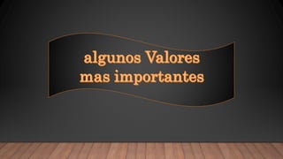 Este documento presenta una lista de valores importantes para la sociedad como la libertad, honestidad, responsabilidad, igualdad, respeto, tolerancia, solidaridad y justicia. Explica brevemente el significado de algunos valores clave como el respeto, el amor, la libertad, la justicia, la tolerancia y la paz, destacando su importancia para promover el bienestar social y las relaciones interpersonales basadas en la dignidad, libertad y diversidad.