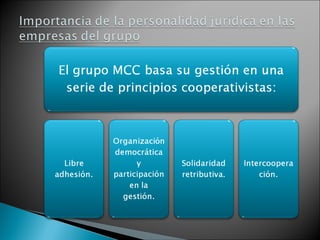 La agrupación empresarial propone la creación de un holding financiero y empresarial llamado MCC para agrupar varias cooperativas bajo el liderazgo de Caja Laboral y Grupo Mondragón, ofreciendo financiación y asesoramiento a las directivas de las cooperativas miembro. Sin embargo, surgen desafíos debido a las diferentes culturas empresariales y reticencia inicial a ceder poder, por lo que se necesita homogeneizar sistemas y crear órganos de comunicación y decisión.