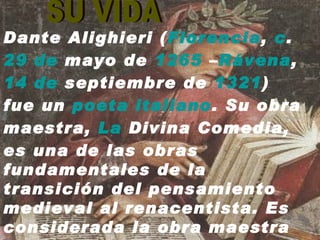 Dante Alighieri fue un poeta italiano del siglo XIII conocido principalmente por su obra maestra La Divina Comedia. Nació en Florencia en 1265 y fue exiliado de la ciudad en 1302 debido a su participación en la política local. Murió en Rávena en 1321, donde fue enterrado. Su poema épico alegórico La Divina Comedia, escrito entre 1304 y su muerte, es considerado uno de los mayores logros de la literatura mundial.