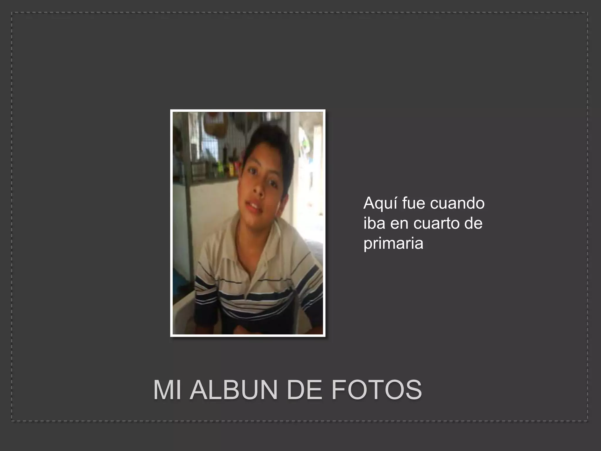 El documento presenta extractos breves de un álbum de fotos personal que describe recuerdos del autor durante diferentes etapas educativas como la primaria, secundaria y preparatoria, incluyendo fotos tomadas en clases específicas y recuerdos de actividades extracurriculares como jugar fútbol.