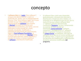 El documento define el software libre como software que respeta la libertad de los usuarios de usar, copiar, estudiar, modificar y redistribuir el software libremente. Según la Free Software Foundation, el software libre se refiere a la libertad de los usuarios para ejecutar, copiar, distribuir y estudiar el software, e incluso modificarlo y redistribuirlo modificado. Aunque el software libre suele estar disponible gratuitamente, no es necesariamente gratis, y puede ser distribuido comercialmente manteniendo su carácter de libre.