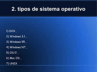 Este documento describe los componentes básicos de un sistema operativo, incluyendo tipos de sistemas operativos como DOS, Windows y Mac OS. Explica que un sistema operativo es un programa que controla los componentes de hardware de una computadora y permite la ejecución de otros programas. También describe características comunes de los escritorios de Windows como barras de tareas, ventanas y accesorios como desfragmentación de discos y restauración de sistemas.