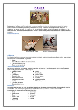 La danza es una forma de arte que utiliza el movimiento del cuerpo, generalmente acompañado de música, para expresar sentimientos, emociones y realizar interacciones sociales. Existen diversos géneros de danza como el ballet clásico, danza contemporánea, danzas tradicionales y folclóricas, y bailes modernos. La danza cumple funciones artísticas, de entretenimiento y religiosas en diferentes culturas.