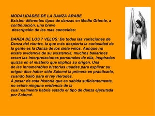 Existen varios tipos de danzas árabes, incluyendo la Danza de los Siete Velos, la Danza del Velo, la Danza de la Espada, la Danza de los Cinco Elementos, la Danza del Cantaro, la Danza de la Serpiente, la Danza del Pandero, la Danza del Candelabro, la Danza Khalij y danzas como el Raqs Baladi, el Raqs Sharky y el Saidi Egipcio. Cada danza tiene orígenes y movimientos distintivos que representan conceptos culturales o religiosos importantes