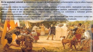 La danza en el Perú colonial reflejó las contradicciones entre las culturas hispana e indígena. Los españoles prohibieron las danzas andinas pero estas pasaron a la clandestinidad. La llegada de esclavos negros introdujo elementos africanos que se mezclaron con lo hispano y andino. Algunas danzas coloniales como el Cápac Colla y los Majueños representaban oficios de la época, mientras que el Negrillo reflejaba la presencia de los esclavos negros.