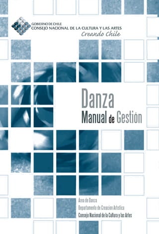 Este documento presenta una introducción al manual de gestión de la danza elaborado por el Consejo Nacional de la Cultura y las Artes de Chile. Explica que el objetivo del manual es entregar herramientas para la planificación, gestión y producción de proyectos de danza, dado que existe poca oferta formativa en este ámbito. Además, resume brevemente los orígenes de la danza, destacando tres vertientes: danza ritual/religiosa, danza de recreación colectiva y danza escénica.
