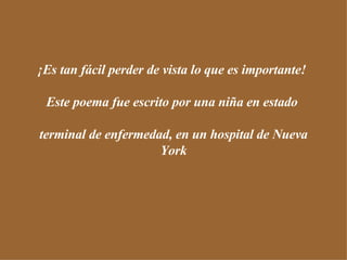 El poema habla sobre la importancia de vivir la vida con calma y apreciar los pequeños momentos en lugar de estar siempre apurado. Recomienda disminuir el ritmo y no "bailar tan rápido", ya que el tiempo es corto y la música se acabará. Aconseja apreciar a los niños en el parque, observar a las mariposas y el atardecer, y no descuidar las amistades por falta de tiempo.