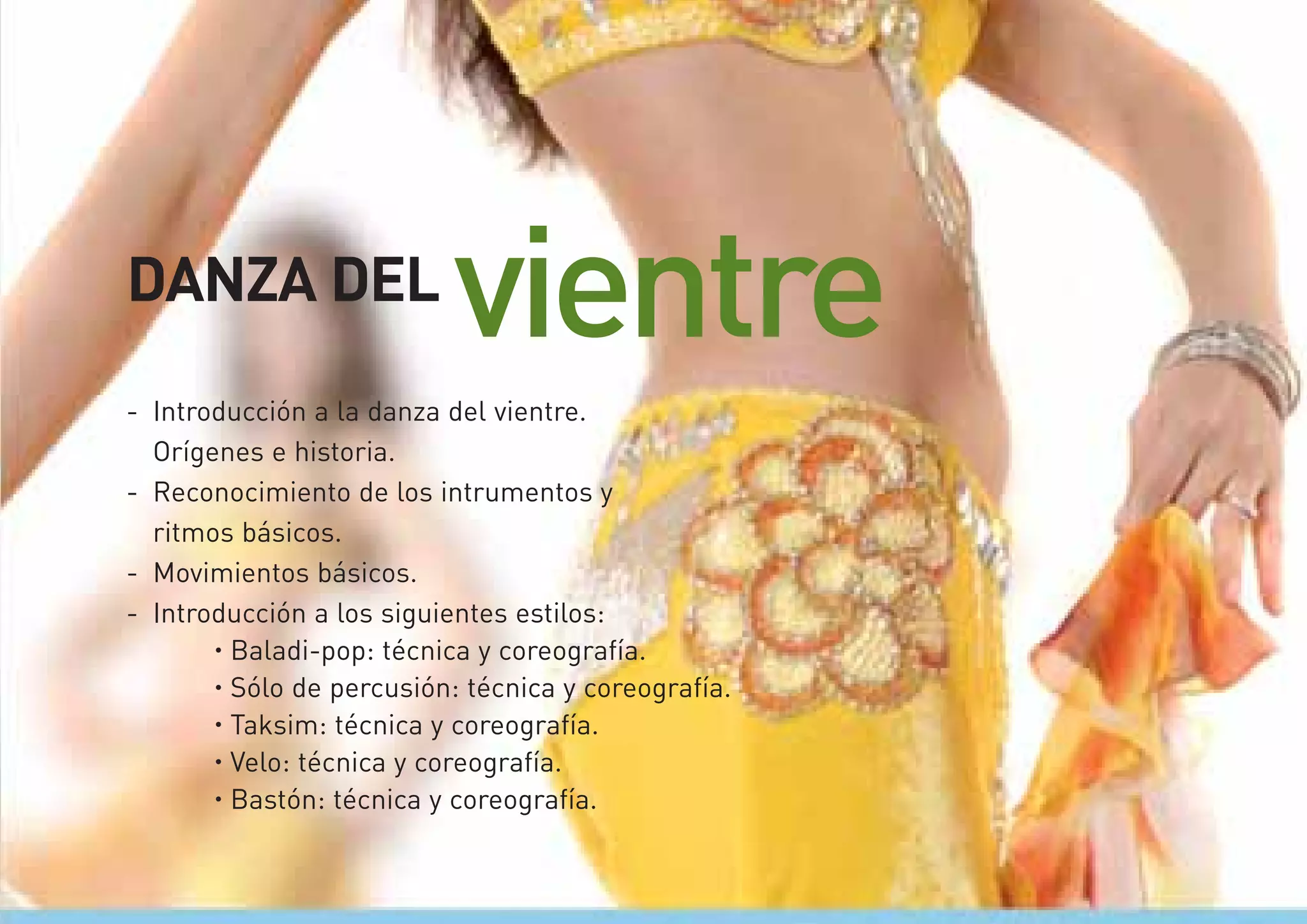 La danza del vientre introduce sus orígenes e historia, reconoce los instrumentos y ritmos básicos, y cubre los movimientos básicos y estilos de danza como Baladi-pop, solo de percusión, Taksim, velo y bastón, incluyendo la técnica y coreografía de cada uno.