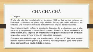 Este documento presenta resúmenes breves sobre el origen y características de varios ritmos y danzas peruanas y latinoamericanas como el cha cha chá, bolero, cumbia, vals, salsa y tango. Describe sus orígenes históricos y geográficos, sus instrumentos musicales comunes, y elementos clave de sus estilos de baile y temáticas musicales.