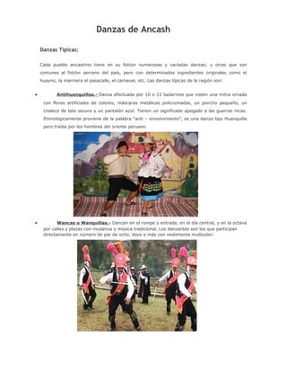 Este documento presenta información sobre varias danzas típicas de diferentes regiones del Perú. Describe brevemente las danzas Antihuanquillas y Wancas de la región de Ancash, así como la Chuscada Ancashina. También resume algunas danzas de Lima como la Resbalosa, Son de los diablos y la historia de la Marinera Limeña. Además, presenta información sobre danzas de Ica como el Alcatraz y el Atajo de Negritos, y sobre danzas de Moquegua como el Wititi. Finalmente,