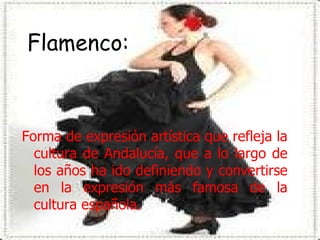 El flamenco es una forma de arte que refleja la cultura de Andalucía y se ha convertido en la expresión más famosa de la cultura española. Consiste en cante, guitarra y danza y transmite emociones y sentimientos a través de la música y el baile. La sevillana es un baile típico de Sevilla que se caracteriza por su gracia, vivacidad y dinamismo. Normalmente se baila en parejas o grupos que realizan diferentes coreografías de forma consecutiva.
