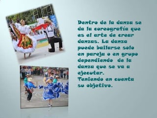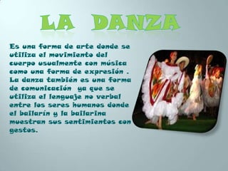 La danza es una forma de arte que utiliza el movimiento del cuerpo, generalmente con música, para expresarse y comunicarse. Dentro de la danza se encuentra la coreografía, que es el arte de crear bailes que pueden realizarse en pareja o en grupo dependiendo del tipo de danza. Este grupo de danzas ha participado con éxito en diferentes festivales y eventos culturales a nivel municipal, departamental y nacional, destacándose y representando con orgullo la cultura de su región.
