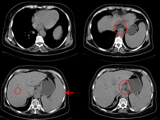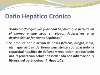 Este documento describe el daño hepático crónico (DHC), la cirrosis hepática y presenta un caso clínico. Explica que el DHC es un daño morfológico y funcional hepático persistente que conduce a la pérdida progresiva de funciones hepáticas. La cirrosis hepática es la etapa final del DHC y se caracteriza por la distorsión de la arquitectura hepática y la pérdida de funciones. Luego presenta el caso de una paciente de 59 años con DHC por hepatitis C que se sometió a exámenes