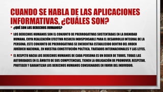 El documento habla sobre los derechos humanos. Explica que son un conjunto de prerrogativas establecidas en la dignidad humana y necesarias para el desarrollo integral de la persona. Algunos derechos humanos mencionados son el derecho a la vida, igualdad, libertad personal e integridad. También describe los principios de universalidad, interdependencia, indivisibilidad y progresividad que rigen la aplicación de los derechos humanos.