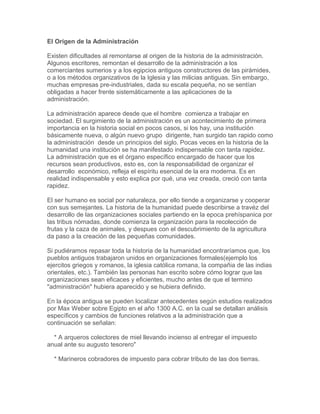 1) Existen diferentes opiniones sobre el origen de la administración, remontándose a civilizaciones antiguas como los sumerios y egipcios, aunque muchas empresas pre-industriales no se sentían obligadas a aplicar sistemas administrativos de manera sistemática. 2) La administración surge a medida que el hombre comienza a trabajar en sociedad y organizaciones formales, y se manifiesta como indispensable rápidamente durante la Revolución Industrial. 3) La administración moderna busca organizar los recursos de manera productiva y eficiente para lograr