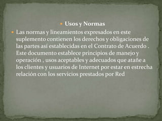 Este documento establece las normas y lineamientos que regulan el uso de servicios de Internet, así como los derechos y obligaciones del cliente en relación con la propiedad intelectual y la seguridad en la red. También se detallan las restricciones relacionadas con el uso de equipos en la biblioteca, el tiempo de utilización y la necesidad de supervisión para usuarios menores de 12 años, además de las responsabilidades por el deterioro de los equipos. Se prohíben actividades como el uso de chats, acceso a contenido inapropiado y la impresión sin autorización.