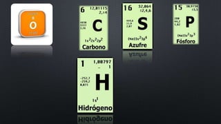 El documento describe los bioelementos o elementos químicos presentes en los seres vivos. Explica que los seis elementos más abundantes son el carbono, hidrógeno, oxígeno, nitrógeno, fósforo y azufre, los cuales componen alrededor del 99% de la masa celular y son los componentes principales de las biomoléculas. Además, clasifica los bioelementos en primarios, indispensables para formar biomoléculas orgánicas como glúcidos, lípidos, proteínas y ácidos nucleicos