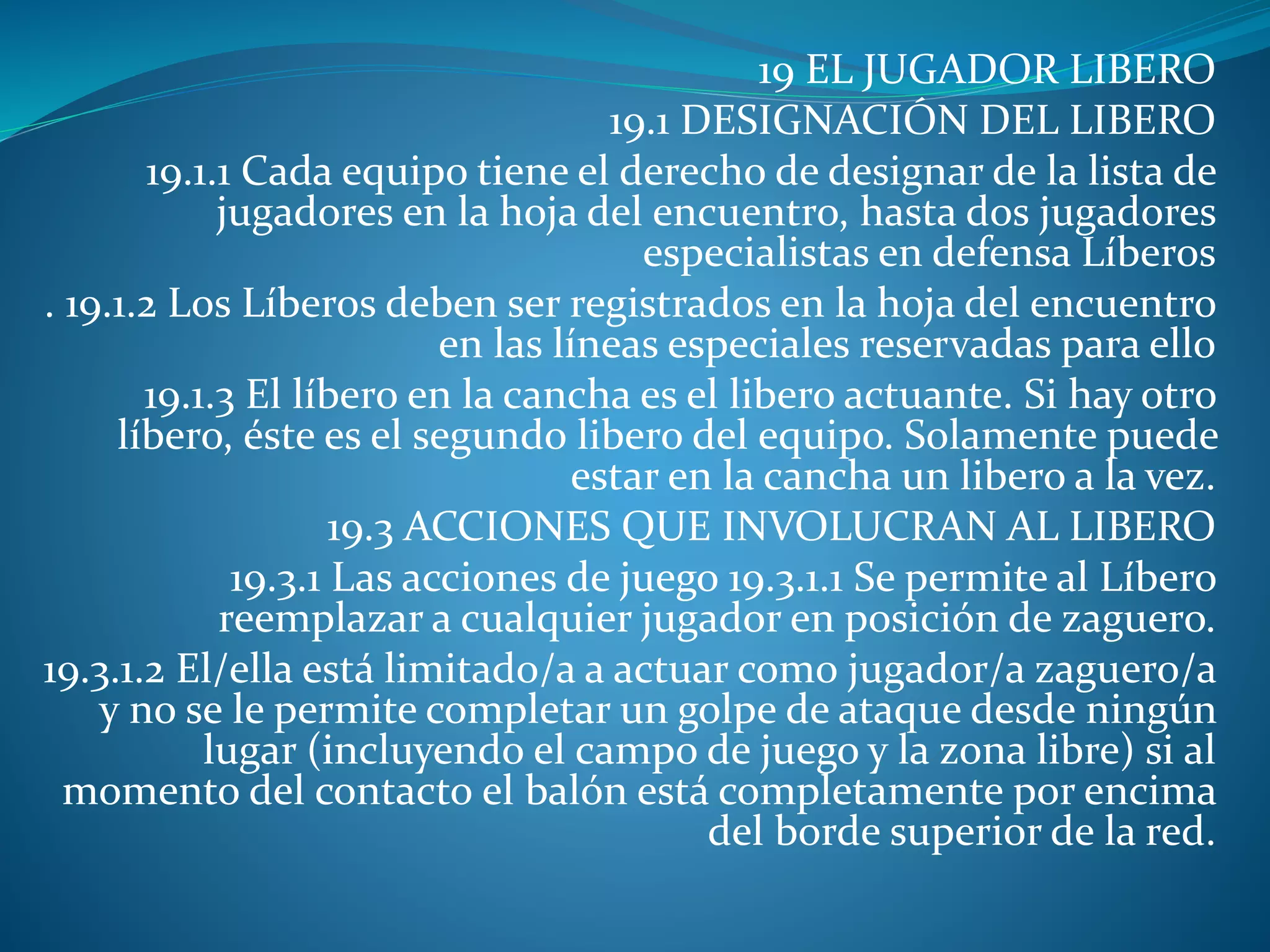 El documento describe las reglas relacionadas con el jugador libero en voleibol. Indica que cada equipo puede designar hasta dos jugadores liberos. Explica las acciones permitidas y limitadas para el libero durante el juego. También cubre los procedimientos para reemplazar o redesignar un nuevo libero si el libero original queda impedido de jugar.