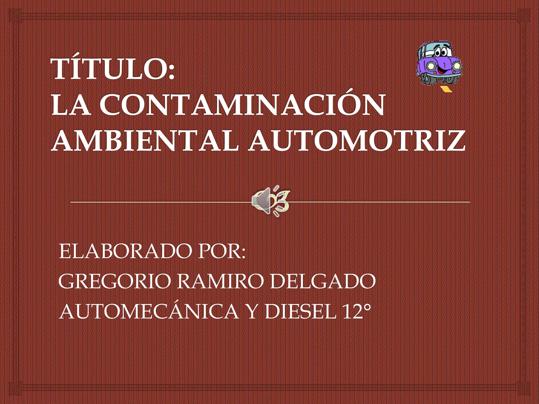 Este documento describe un proyecto educativo desarrollado por Gregorio Ramiro Delgado para estudiantes de automecánica sobre la contaminación ambiental causada por los automóviles. El proyecto incluye una clase teórica, el análisis de videos, la creación de un mapa conceptual y una encuesta para medir las emisiones de los autos y promover su mantenimiento adecuado con el fin de reducir la contaminación.