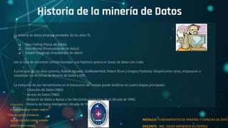 El documento resume la historia y conceptos fundamentales de la minería de datos. Explica que la minería de datos comenzó en la década de 1970 con el objetivo de encontrar correlaciones en grandes bases de datos. Describe los cuatro pasos clave del proceso de minería de datos y algunas técnicas comunes como clasificación, árboles de decisión y redes neuronales. Finalmente, presenta un proyecto de un grupo para predecir ventas aplicando minería de datos a los datos de una tienda de bicicletas.