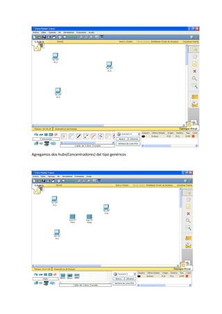 Este documento describe cómo configurar una topología de red simple utilizando dispositivos de capa de enlace como switches y hubs en Packet Tracer. Incluye las instrucciones para agregar 3 PCs, 2 hubs y un puente o switch, asignar direcciones IP a las PCs, conectar los dispositivos con cables y probar el envío de paquetes entre las PCs a través de los dispositivos de capa de enlace.