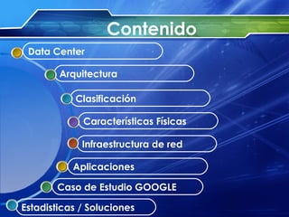 Este documento describe los componentes clave de un data center, incluyendo su arquitectura, clasificación, características físicas e infraestructura de red. También presenta estadísticas sobre el número de servidores en data centers de grandes empresas como Google y detalla las soluciones de seguridad, energía y enfriamiento que proveen compañías como Panduit, Alestra y KIO Networks para sus propios data centers.
