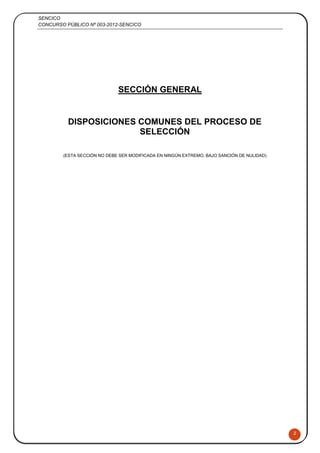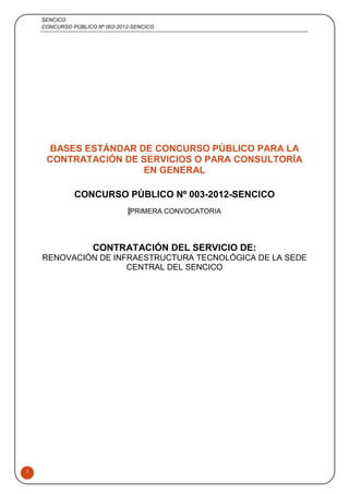Este documento presenta las bases estándar de un concurso público para la renovación de infraestructura tecnológica de la sede central del SENCICO. Describe las etapas del proceso de selección, incluyendo la convocatoria, registro de participantes, formulación y absolución de consultas y observaciones, integración de las bases, presentación y evaluación de propuestas. También establece los requisitos para la presentación de propuestas y acreditación de los participantes.
