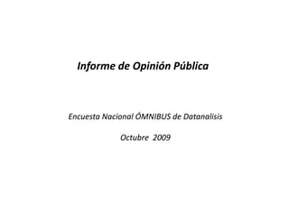 El documento resume los resultados de una encuesta nacional realizada en Venezuela en octubre de 2009. La encuesta midió la aprobación presidencial, la satisfacción con políticas públicas y la confianza en el presidente. La aprobación presidencial fue de 46%, mientras que la desaprobación fue también de 46%. Algunas políticas como educación y salud tuvieron mayor satisfacción que otras como empleo y seguridad.